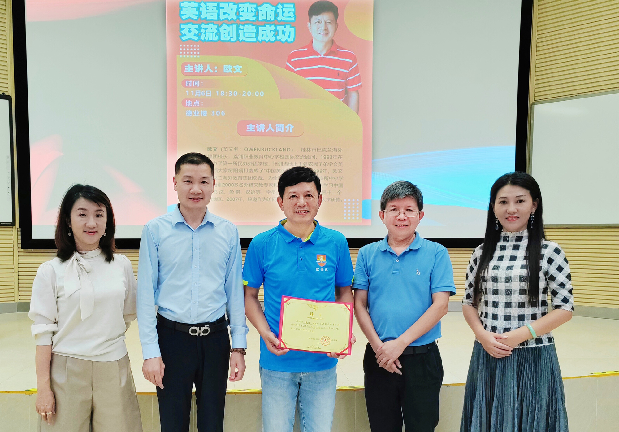 据悉,这次商务外语学院邀请欧文讲学,缘于刘建珠副院长2023年9月的一次阳朔之行,读到了一本关于欧文的长篇报告文学《英语改变命运》。