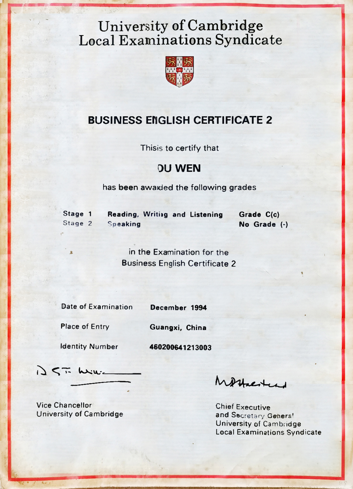 他来到英国剑桥大学授权的商务英语证书(BEC)广西师大考试认证中心,参加了正规培训和认证考试,成为阳朔第一个有剑桥大学校长签名认证的“剑桥商务英语证书”获得者。