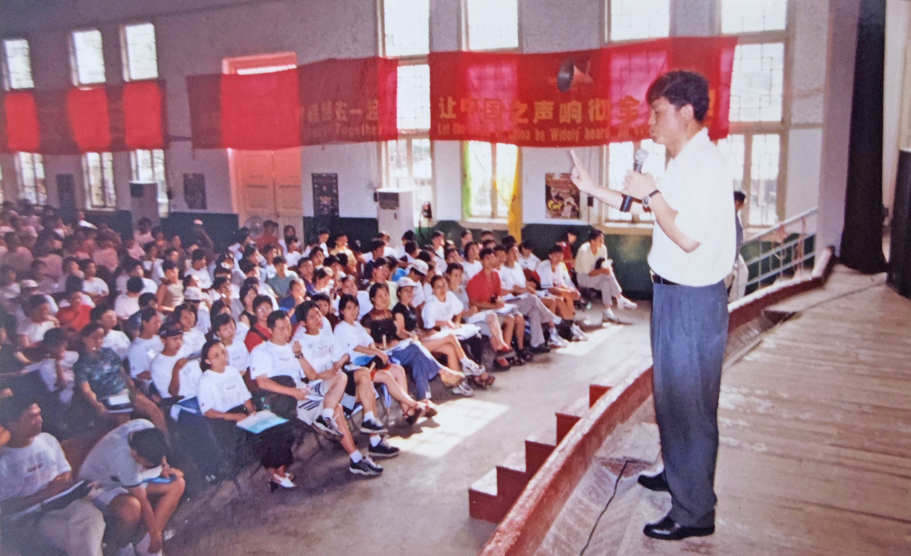 台下一片呼应叫好。李阳接着宣布:“现在,桂林就有个巴克兰商务外语学校正在做这件事!我们请他们的校长上台讲话!” 掌声中,欧文走到演讲台中央。