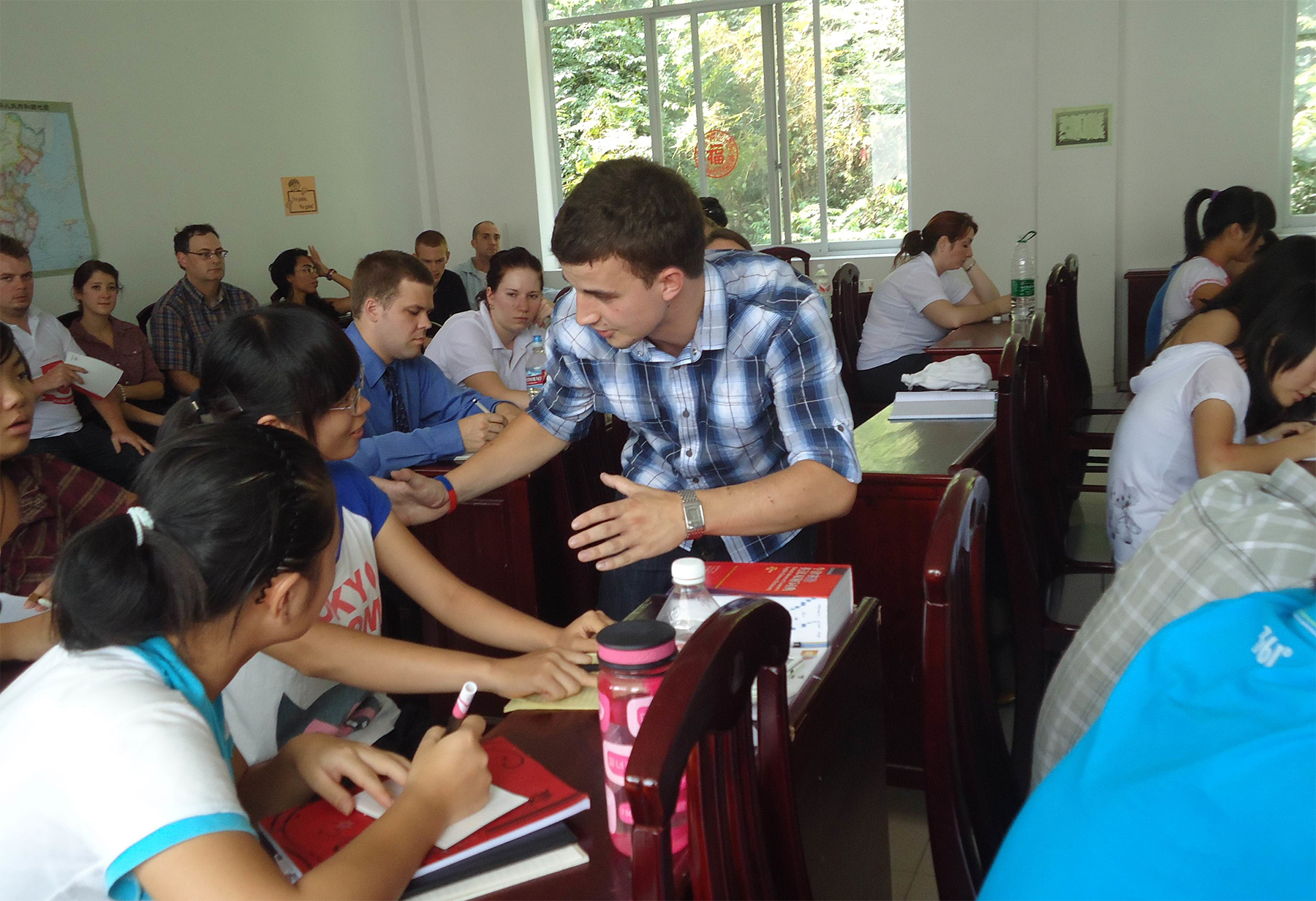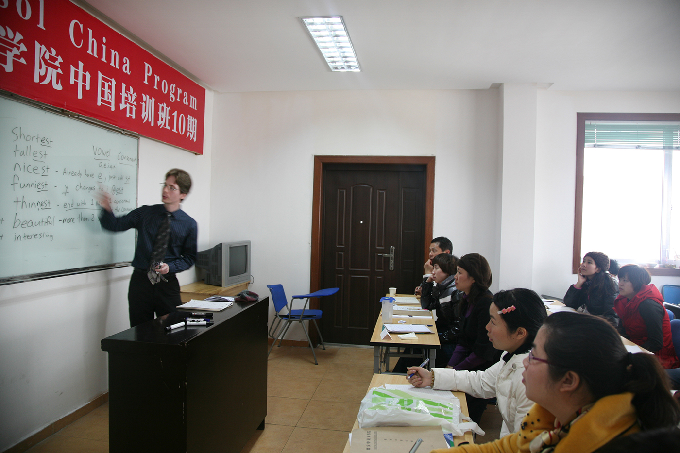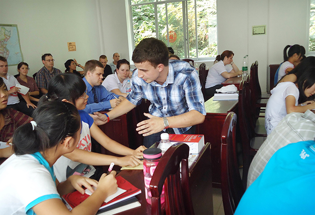 除了为期一周“特硕(TESOL)”专业课程培训,欧文会用一整天时间向刚来到中国的老外们介绍中国文化习俗、法律法规、中国教育基本国情……流利的英语,幽默的表达,鲜活的实例,生动的故事,使老外在轻松的笑声中进一步了解中国,铺就他们未来的工作生活之路。
