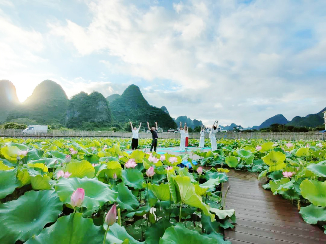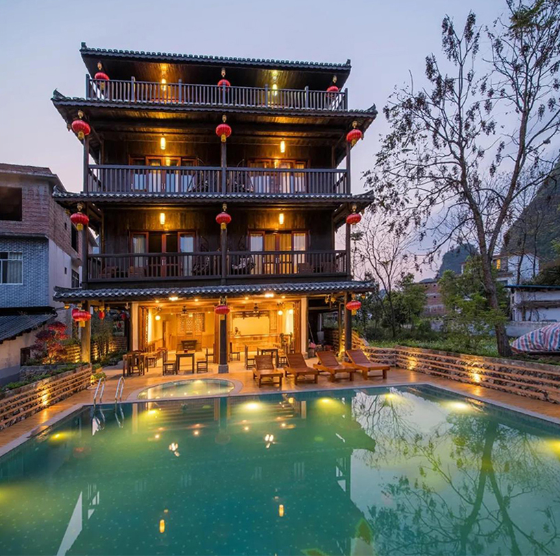 上面几幅图就是陈文刚最先创办的阳朔精品民宿酒店“水云阁”。有水有云,名副其实。从不起眼的农家院门进去,里面却别有洞天,除了泳池和嵌于古朴建筑中的现代设施,酒店后面数个篮球场大的荷塘独具特色,有木栈道通往荷塘中央,直达偌大一个木栈平台;伴着甲天下的山水在夕阳中晚餐、开派对、搞活动、清晨锻炼做瑜伽,那是怎样一种绝妙去处?又有怎样一种绝妙体验?水云阁竟有如此高雅品位!