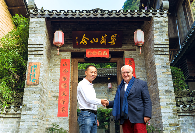 2019年,法国前总理拉法兰(Jean-Pierre Raffarin)来阳朔,慕名前来骥马古村,体验了墨兰山舍独有的中国民间古建筑韵味儿。拉法兰大概不会想到与他握手的这位墨兰山舍主人,当年为了练英语口语,曾穿着自制的印有“You Know Richard, You Know China!”广告语的T恤活跃在外宾云集的码头、酒店……